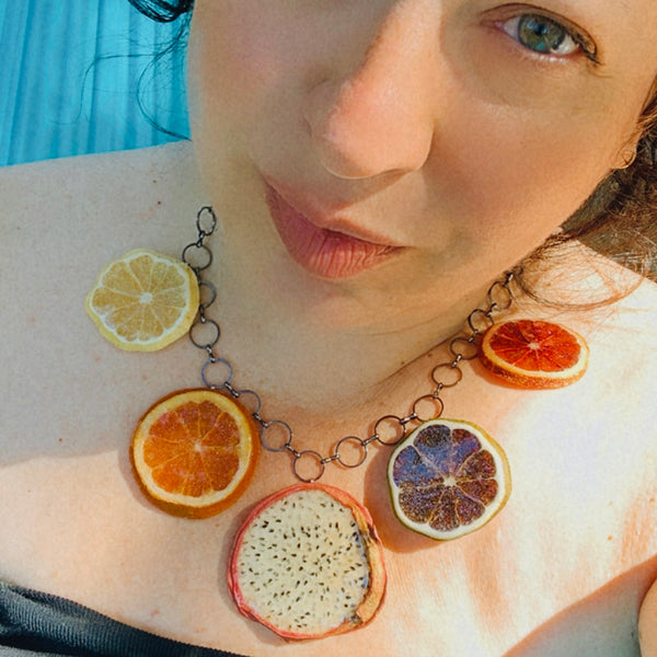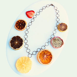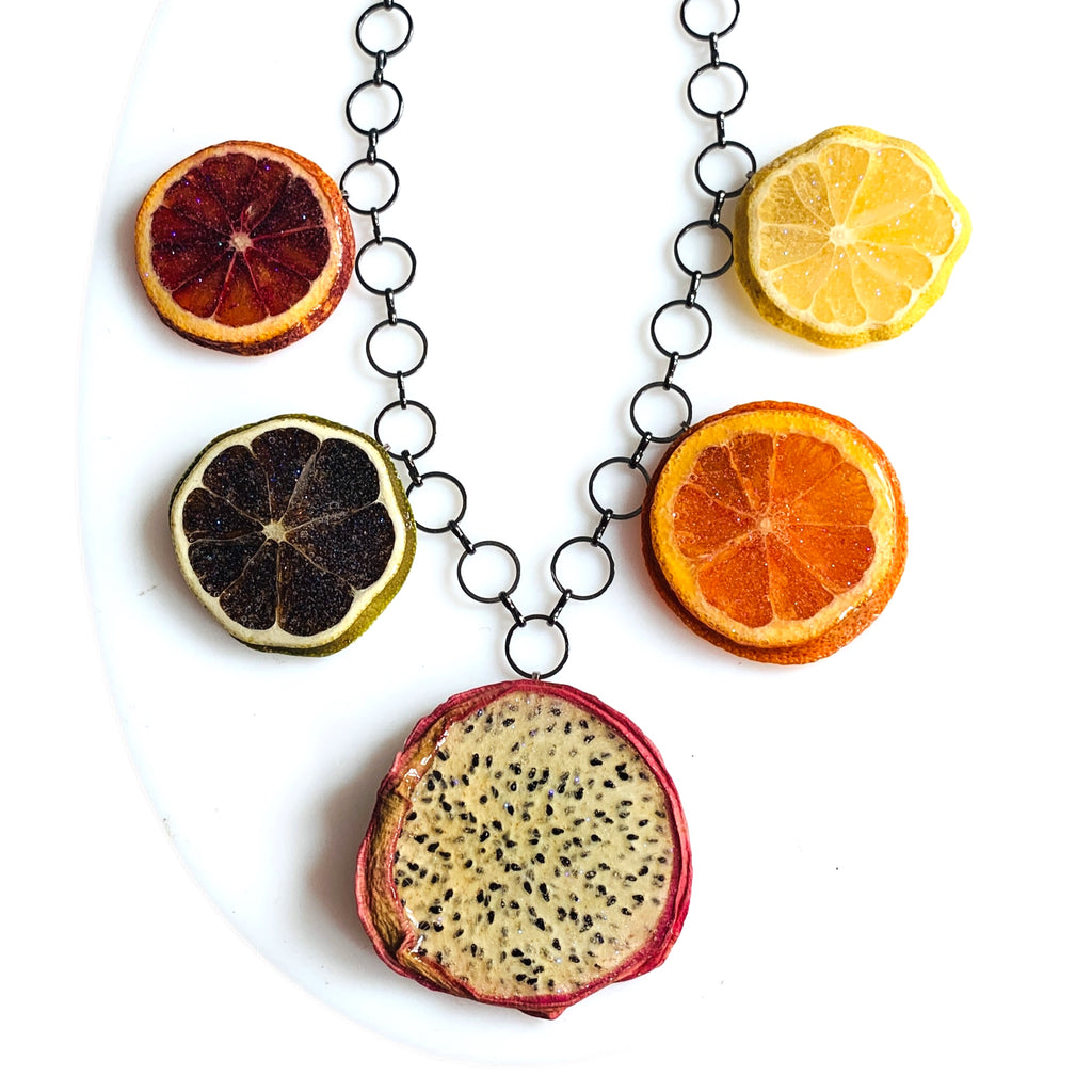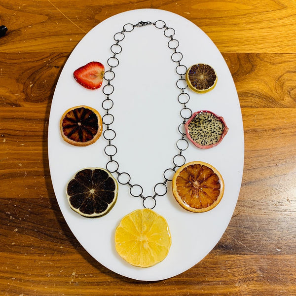 Real dried fruit encased in our glitter resin on an 18” gunmetal chain.
