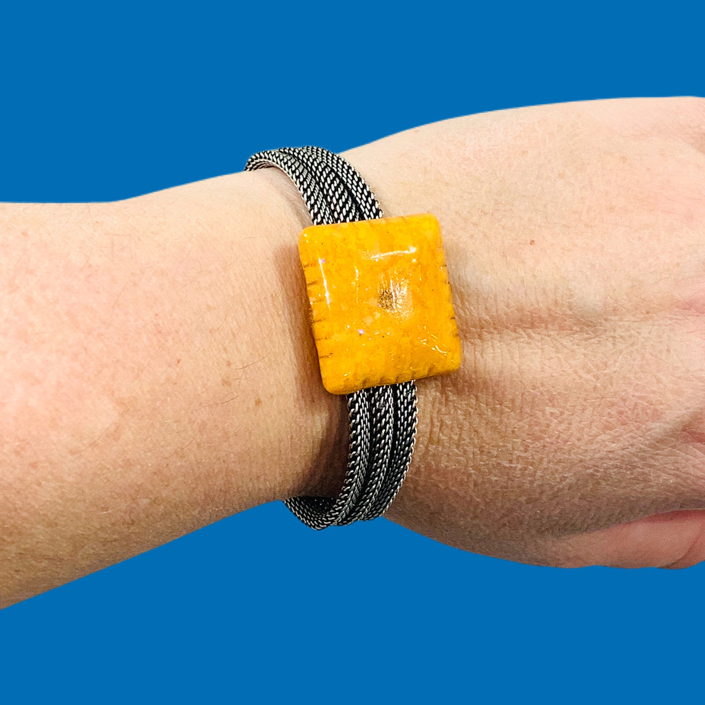 The Cheeseit Snack bracelet is made with a real snack encased in our glitter resin. The finish is oxidized sterling silver and it connects with a strong magnet, very easy to put on.
