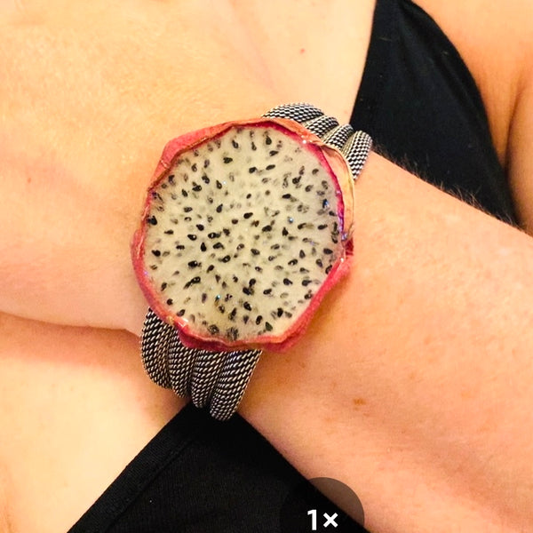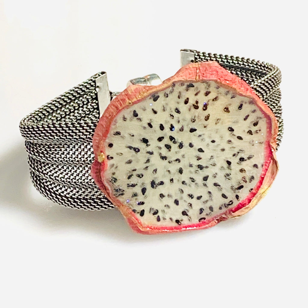 Made from a real slice of Dragonfruit encased in glitter resin. The bracelet is 6" and connects with a magnetic clasp. Oxidized silver plated.