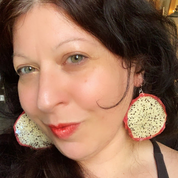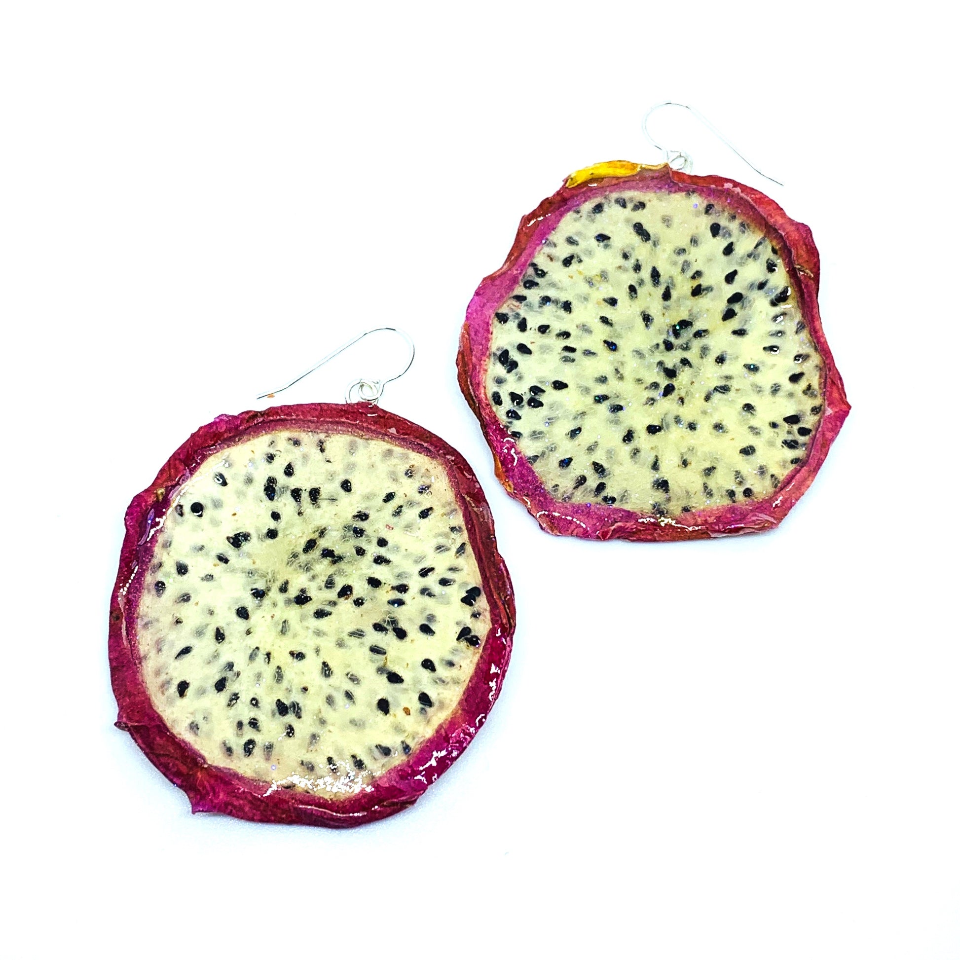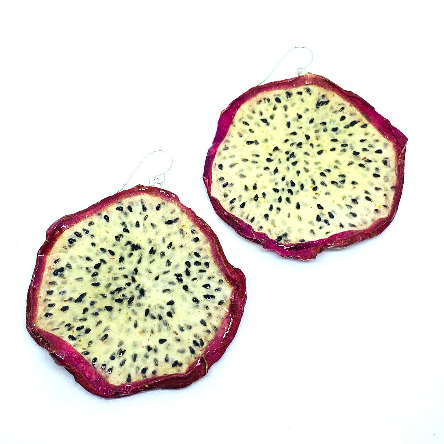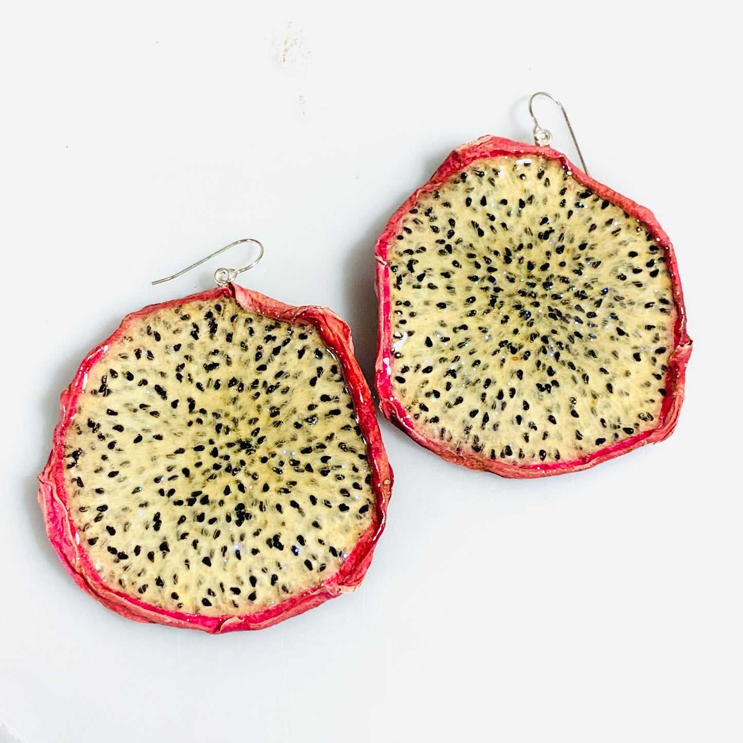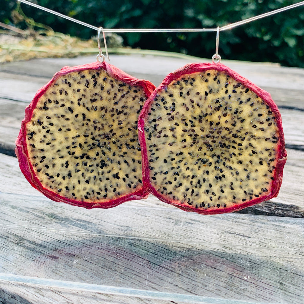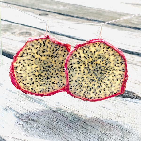Gorgeous slices of real dragonfruit encased in our glitter resin make for a perfect summer earring. Wear as you sip a cold drink on a hot day.