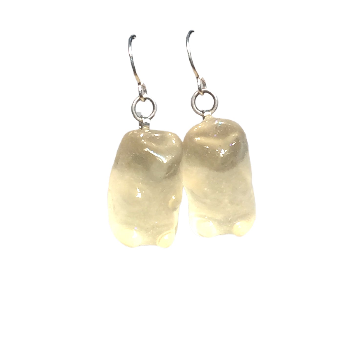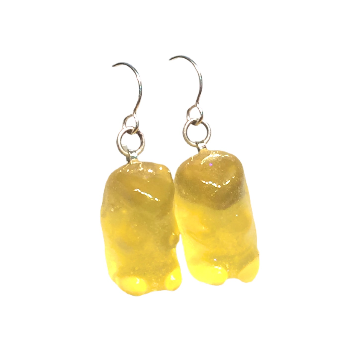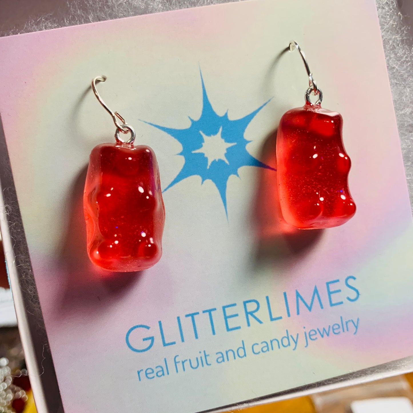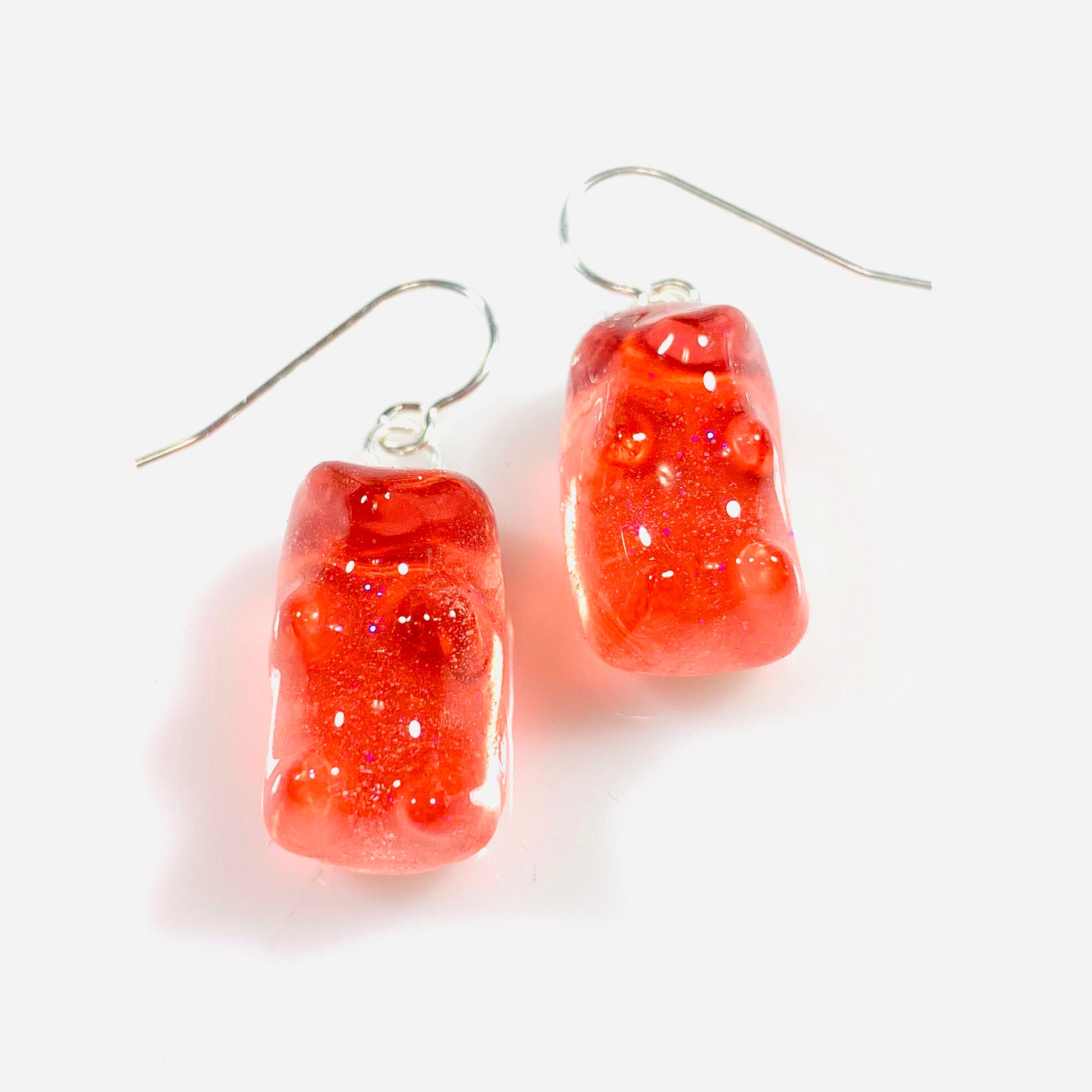 We encase the gummy bears in glitter resin and hang them from sterling silver hooks