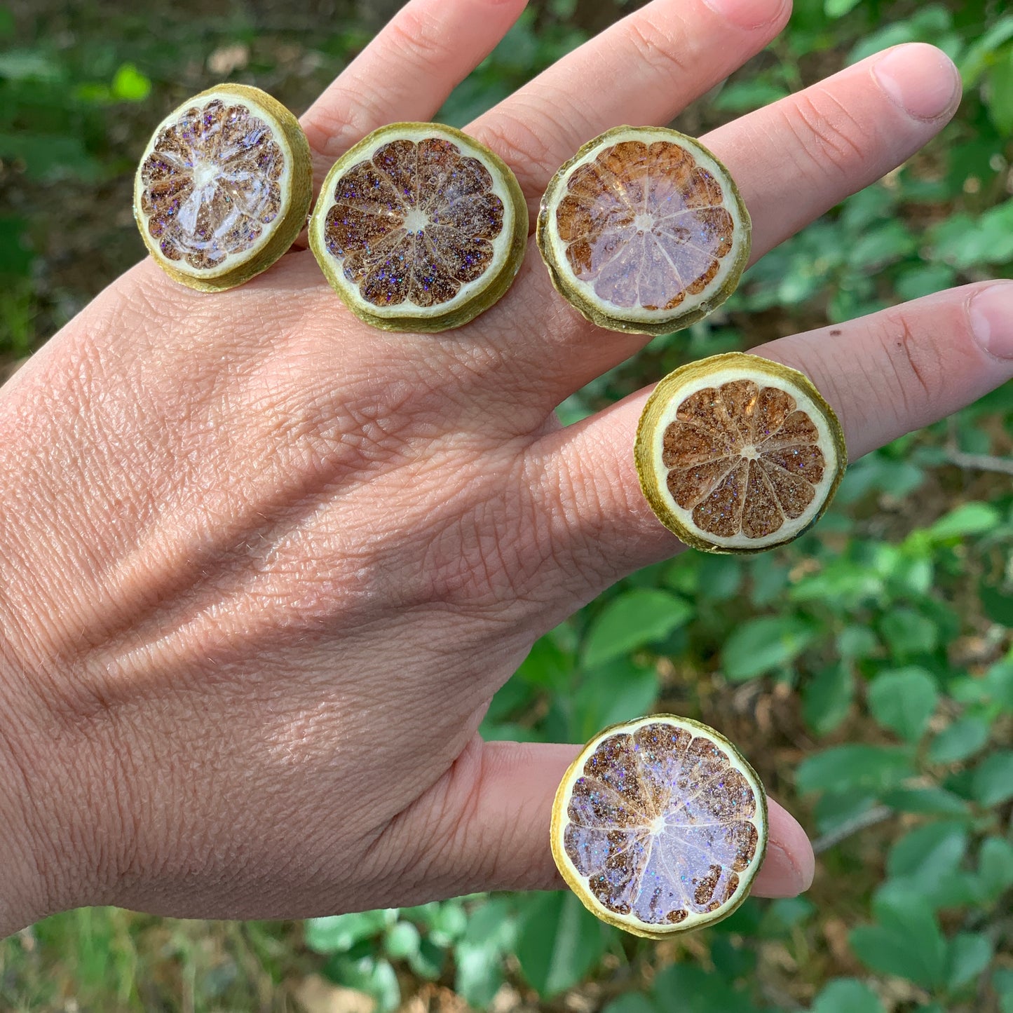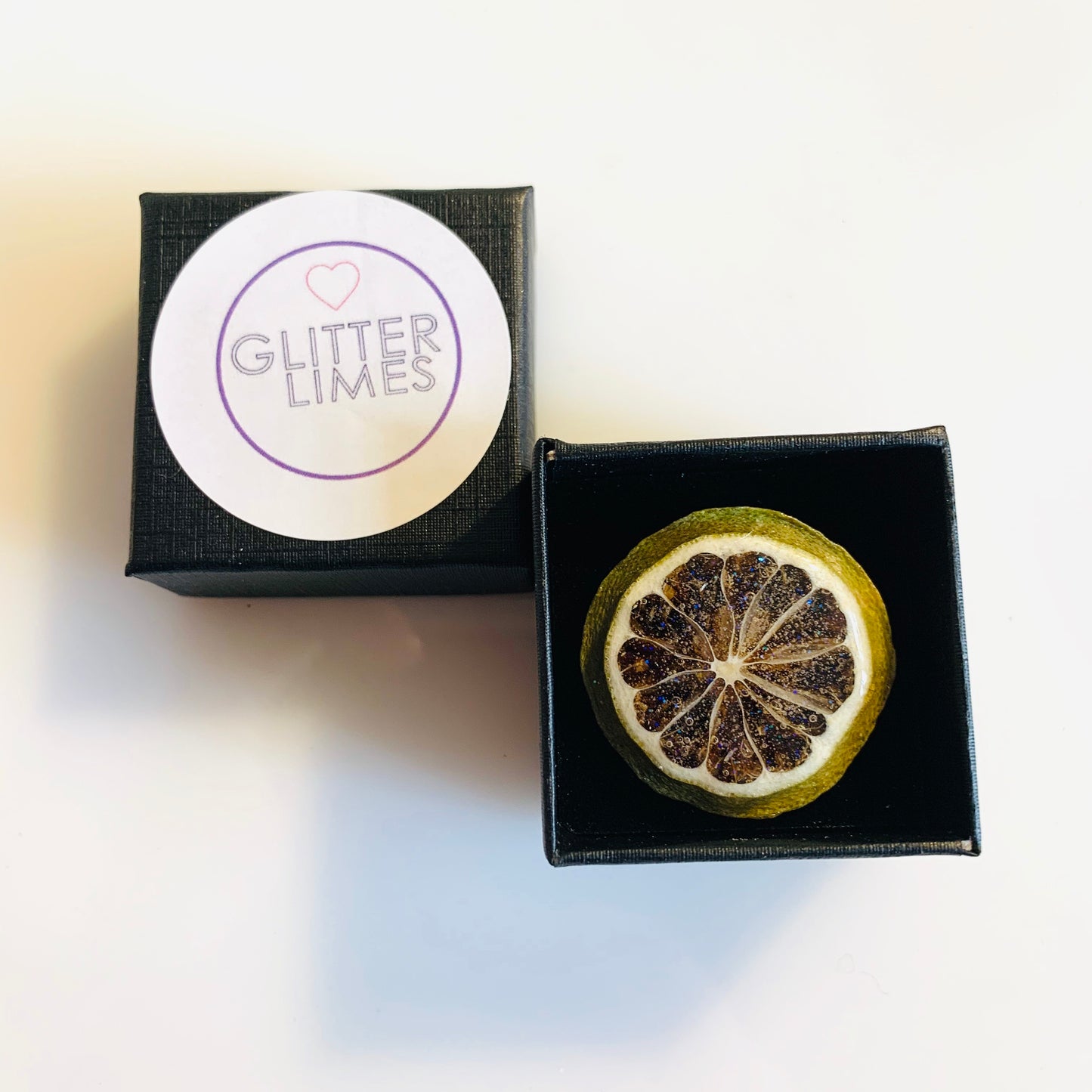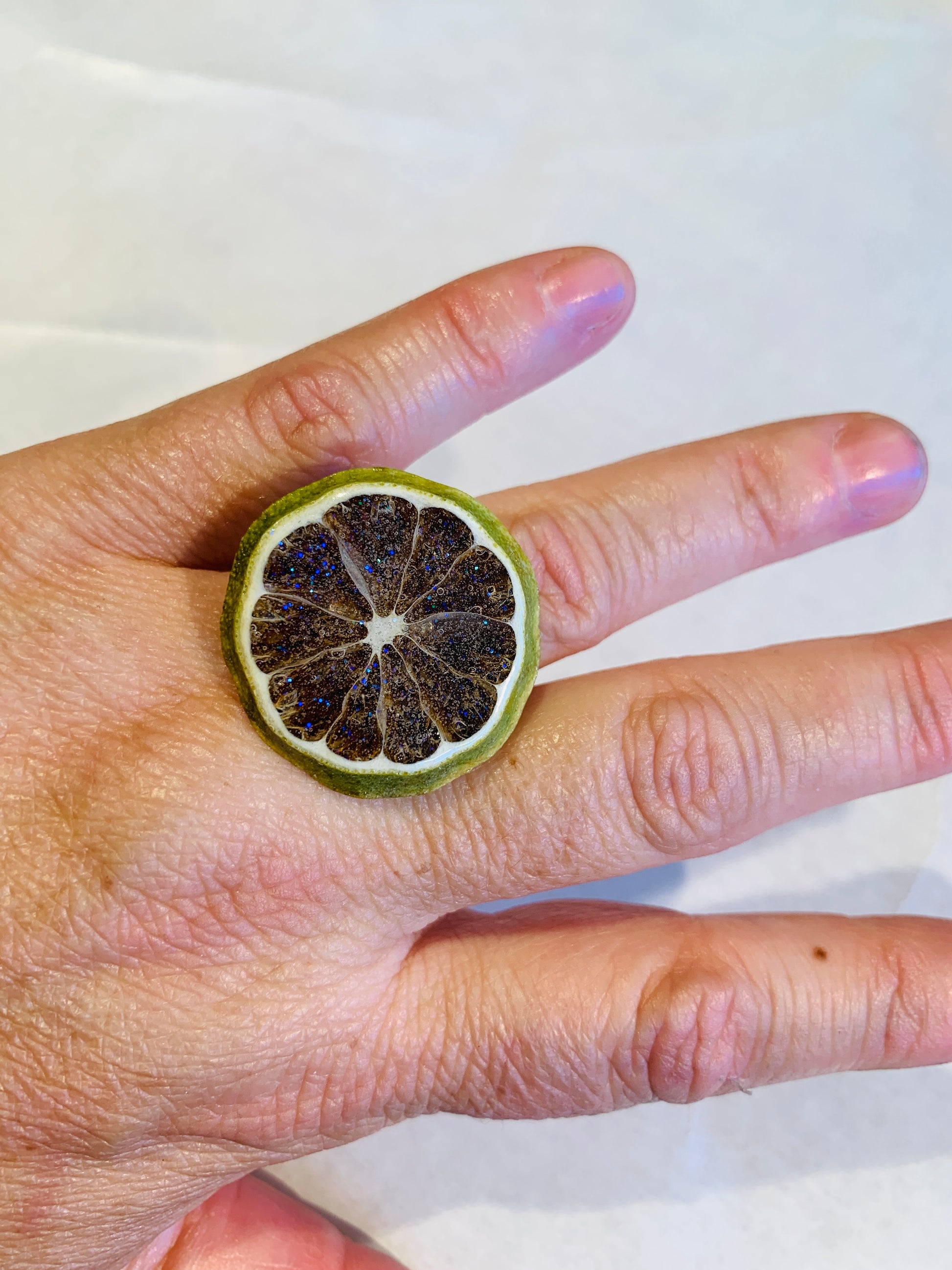 The Classic Keylime Ring is made with an adjustable silver plated ring. Each lime is unique and encased in our glitter resin.