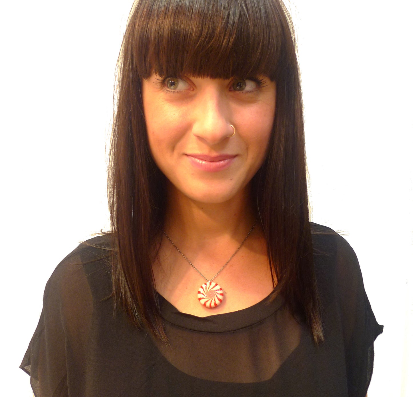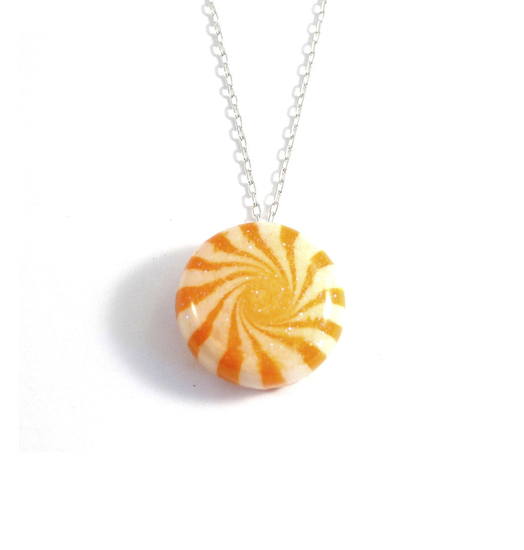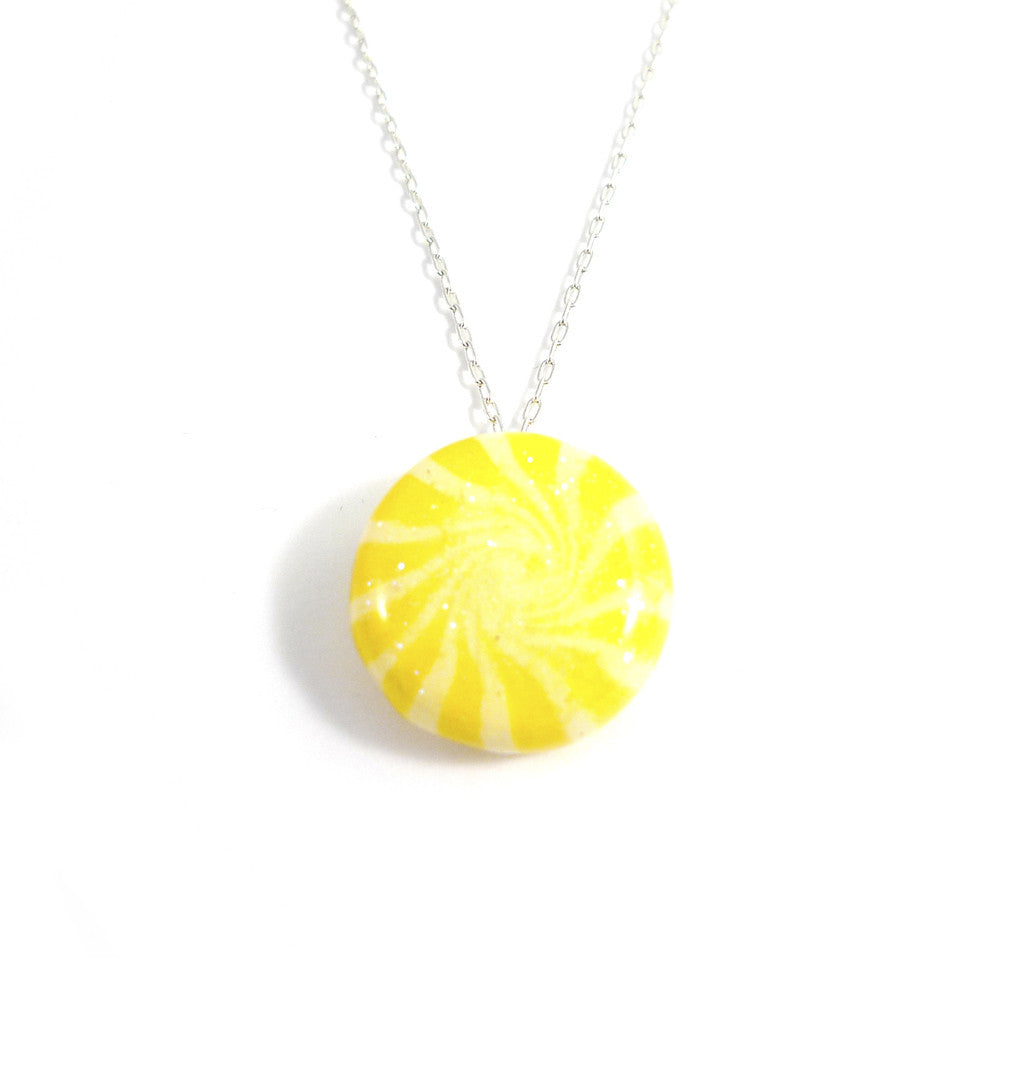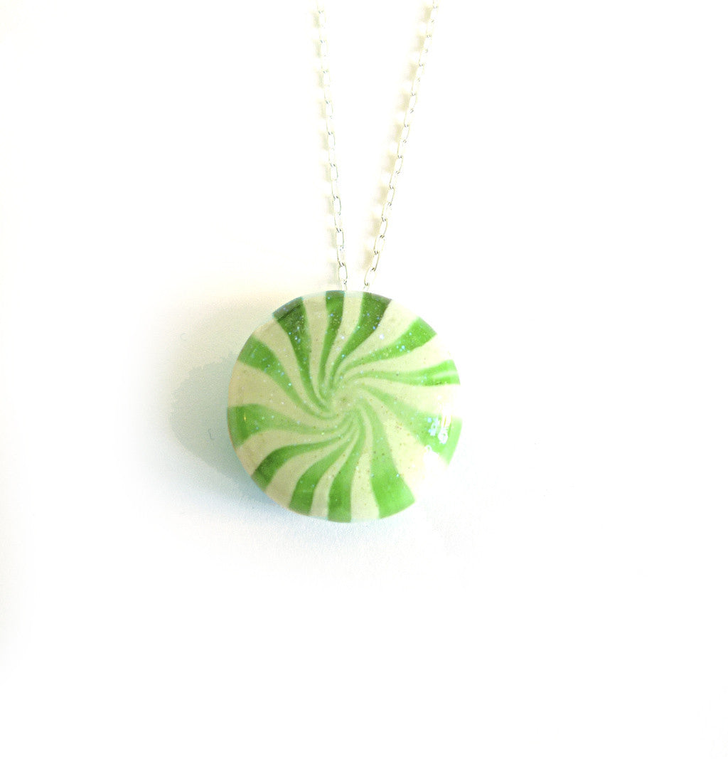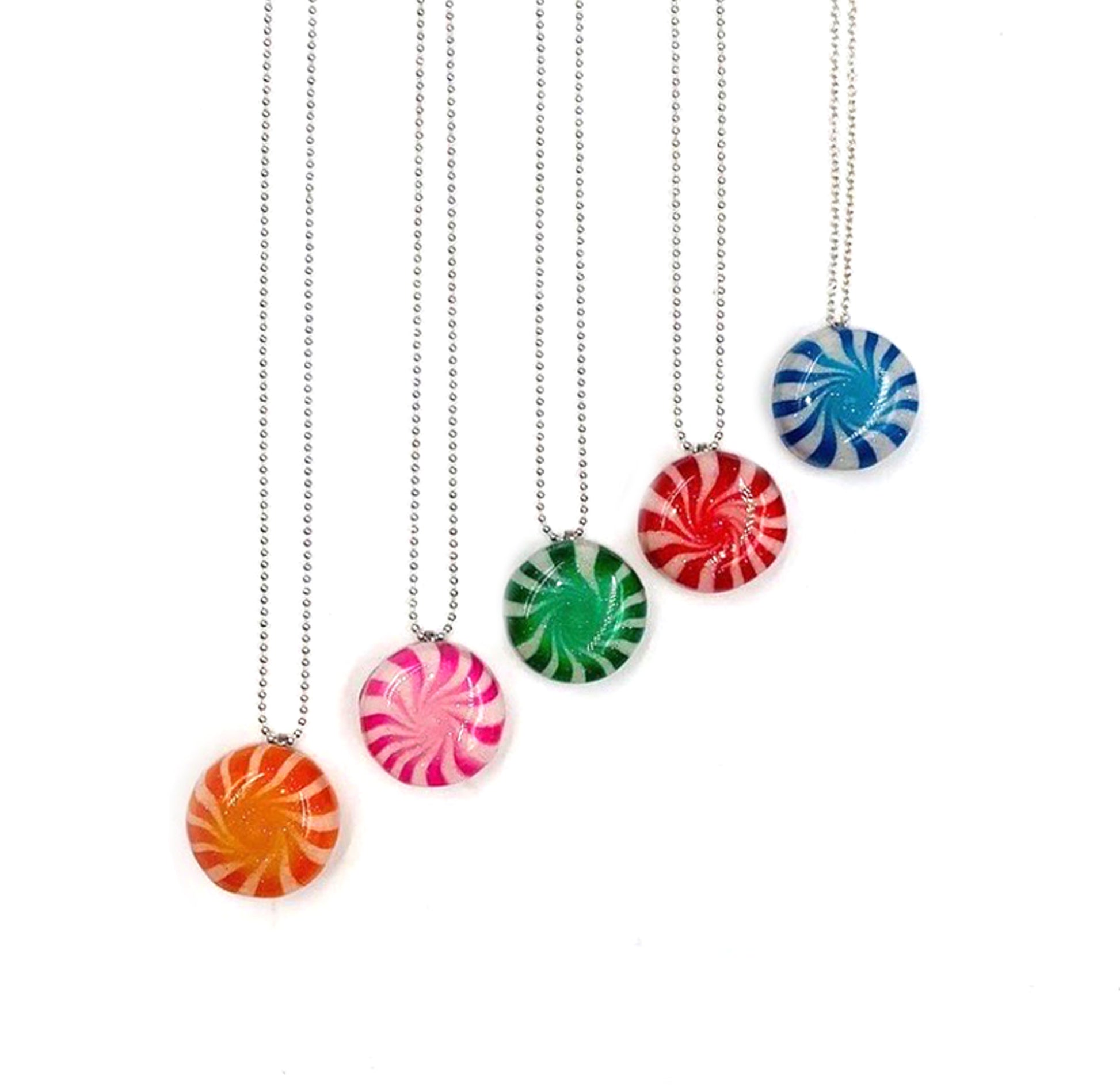 Our candy jewelry hangs on a sterling silver plated 18" chain.